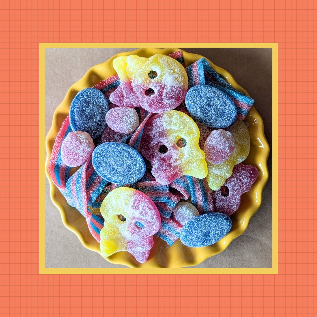 Lemon raspberry Bub skulls, S-Marke blue raspberry, blazpberry belts, mini sour strawberries.